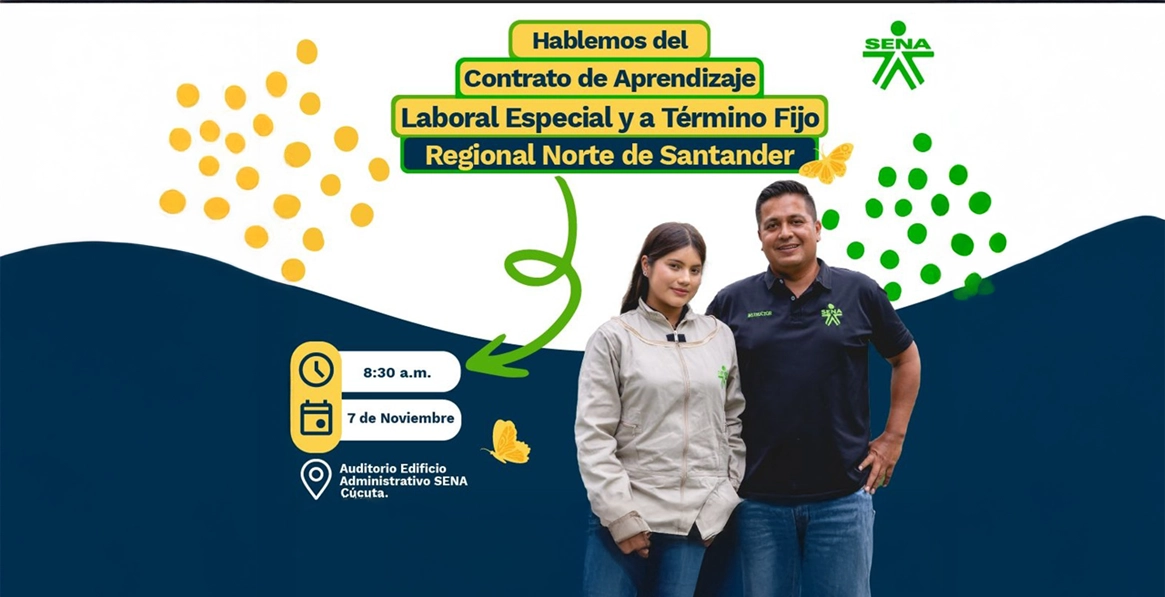 Acompáñanos este 7 de noviembre a las 8:30 a.m. en el Auditorio del Edificio Administrativo SENA Cúcuta y aprende sobre el Contrato Laboral Especial y a Término Fijo.